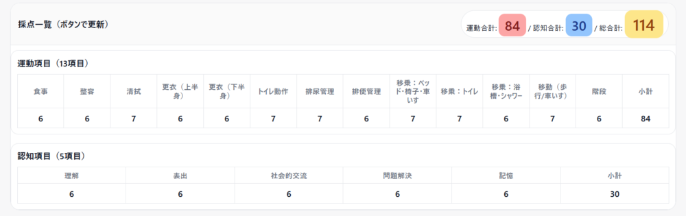 選択していくだけで、運動合計・認知合計・総合計まで自動で集計できます。新人教育やカンファ資料づくりの下準備にも便利です。
